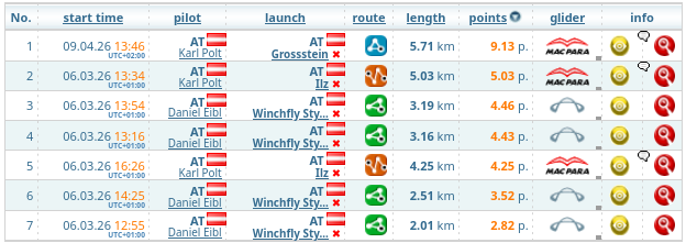 Es zählt jeweils der kilometermäßig weiteste Flug eines jeden Piloten in 2026 von einem Schlepp-Startplatz von Winchfly Styria.
